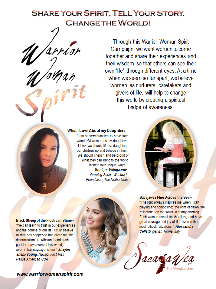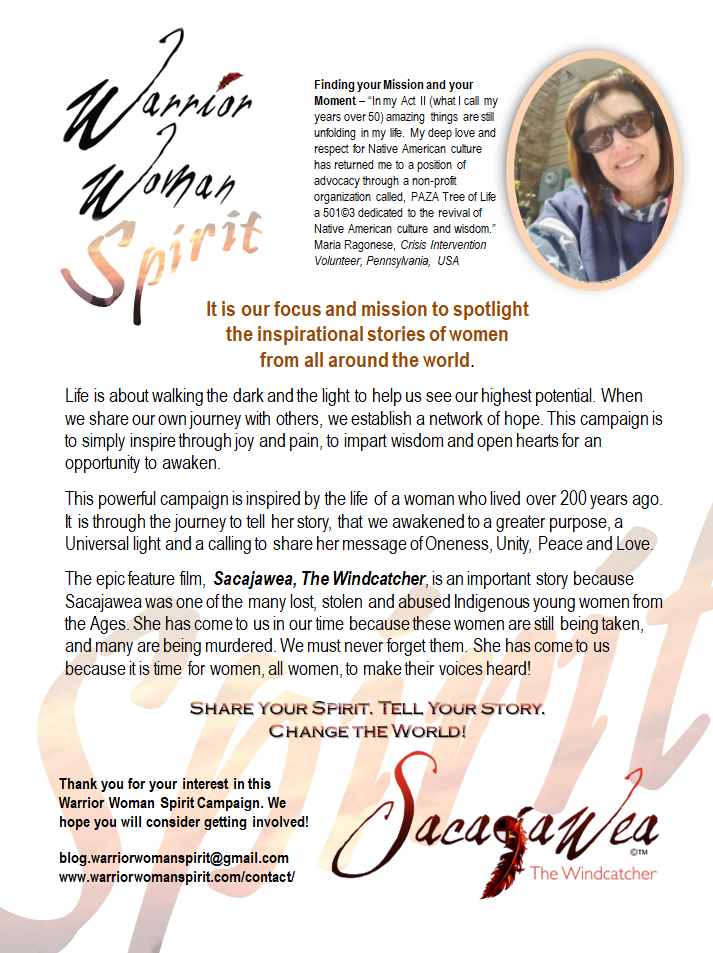 Warrior Woman Spirit campaign was created in the spirit of Sacajawea as we recognize she was one of the many lost, stolen and abused Indigenous women from the Ages. We urge women of the world to “Share your Spirit. Tell your Story. Change the World.”