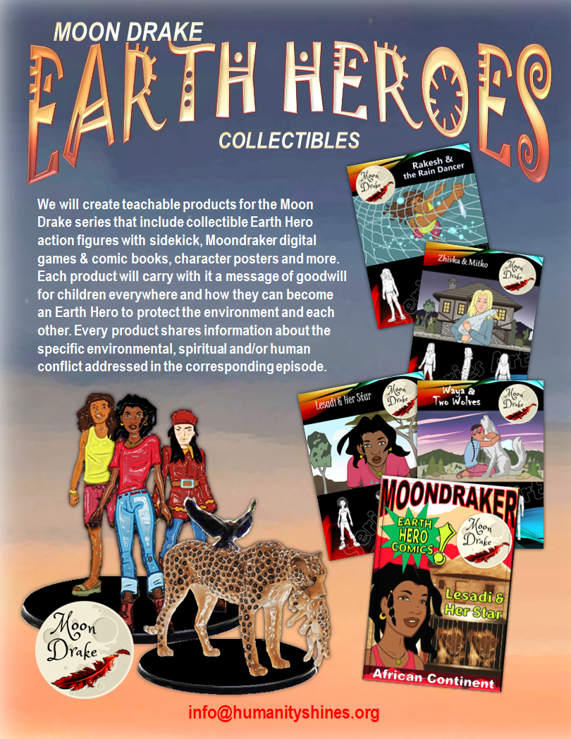 Our Moon Drake Earth Heroes program, based on the Moon Drake series, creates action figures, books and comics, digital games and other toys addressing environmental, spiritual and/or human conflicts. It also invites children to become Earth Hero Ambassadors.